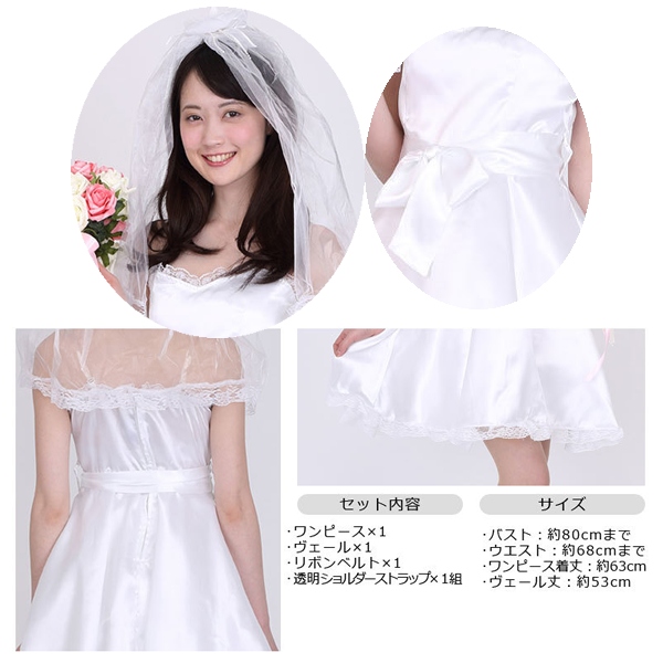 サイズ/バスト約80cmまで、ウエスト約68cmまで、ワンピース着丈約63cm、ヴェール丈約53cm