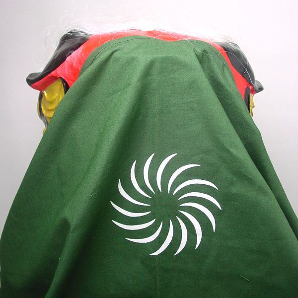 獅子頭・獅子羽織(唐草生地)・鈴が一体となった、豪華な獅子舞かぶりものセットです。