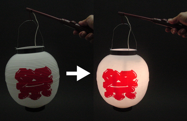 普通サイズのちょうちん(直径30cmくらいまで)なら釣下げて持ち歩く事が出来る、ちょうちん用電球棒です。