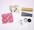 紙管×1、上下キャップ×各1、トレー上下×各1、カラー透明板(赤・桃・黄・緑・青)×各1、ミラー×3、モール(赤・緑・黄)×各1、千代紙×1、ケント紙×1、おはじき×1