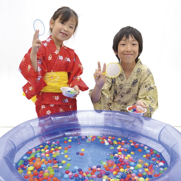 スーパーボールすくいに必要なプール(水槽代わり)、すくいポイ、カップ、スーパーボールの全てが入っている簡単便利、手軽なセットです。