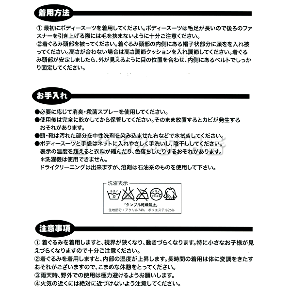 素材/頭部=発泡スチロール・ポリエステル・アクリル、 スーツ・手袋・靴=ポリエステル・アクリル