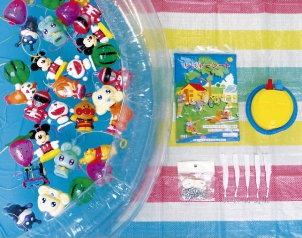 キャラクターヨーヨー(よく伸びるゴムと手持ちの輪付)各種100ヶ、吊り針30ヶ、吊り紙100枚、プール(直径約80cm)1ヶ、エアポンプ1ヶ、シート1枚