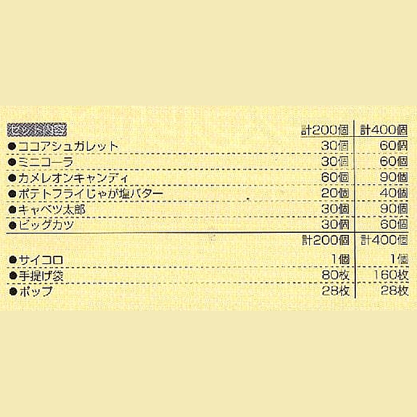景品200ヶ、手提げ袋80枚、サイコロ1ヶ、ポップ1枚