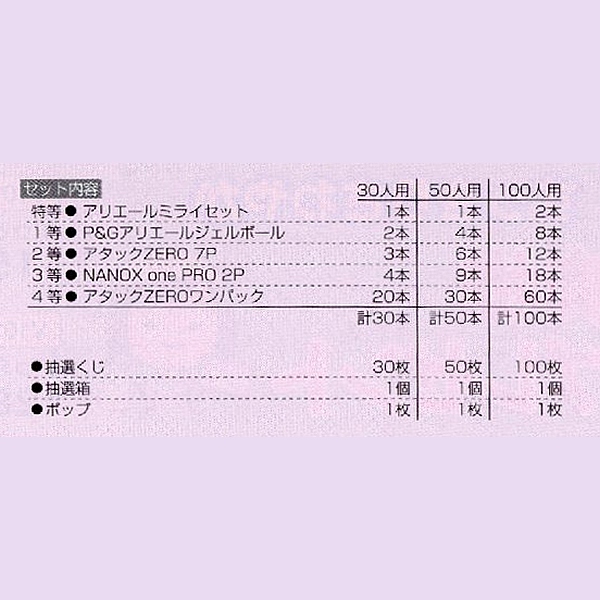 景品50ヶ、抽選くじ50枚、抽選箱1ヶ、ポップ1枚