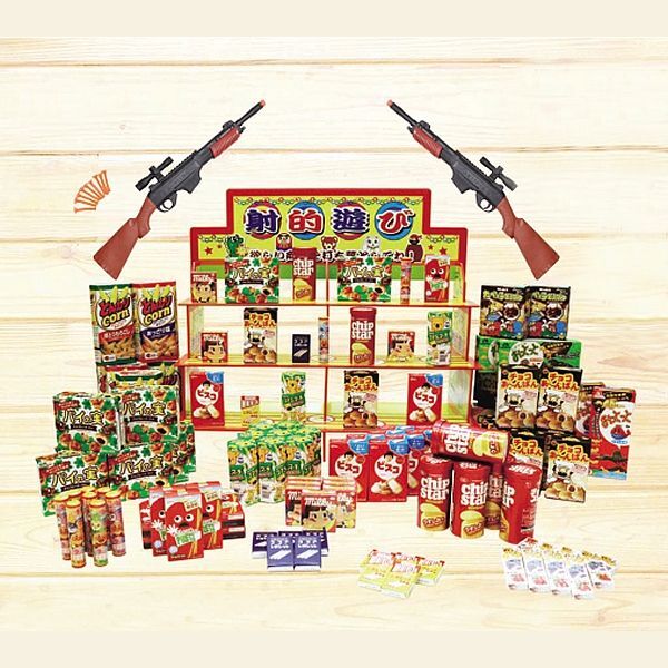 お菓子各種100ヶ、射的台1ヶ、射的打ち2丁、吸盤弾20ヶ