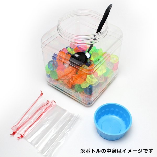 おもちゃの宝石きらきらボトル型約300ヶ、箱1ヶ、お玉1本、カップ1ヶ、お持帰り袋100枚