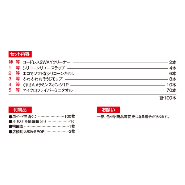 抽選クジが付いていますので、クジ引きで出た等数の景品をお渡しします。賞品、抽選くじ、抽選箱など全て揃ったセットですので、簡単に抽選会イベントが開催出来ます。【仕様】100名様用【セット内容】景品100…