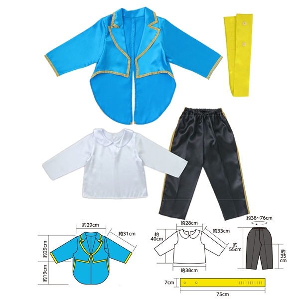 サイズ/ブラウス着丈約40cm×肩幅約28cm×袖丈約33cm、パンツウエスト約38〜76cm×総丈約55cm×股下約35cm、ジャケット着丈約48cm×身幅約29cm×袖丈約31cm、ベルト約75×7cm