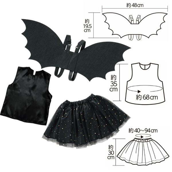 サイズ/トップス着丈約35cm×胴回り約68cm、スカートウエスト約40〜94cm×総丈約30cm、羽根19.5×48cm