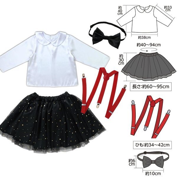 サイズ/トップス着丈約40cm×肩幅約28cm×袖丈約33cm、スカートウエスト約40〜94cm×総丈30cm、サスペンダー長さ約60〜95cm×ゴム幅約2.5cm、蝶ネクタイリボン部分約6×10cm×ひも部分約34cm〜42cm