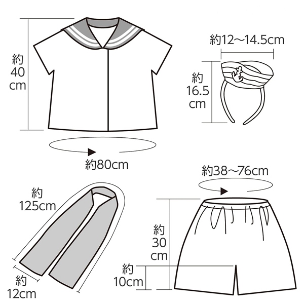 サイズ/トップス着丈約40cm×身幅約40cm×肩幅28cm、ズボン総丈約30cm×股下約10cm×ウエスト約38cm、スカーフ約125×12cm、カチューシャ約12×17cm
