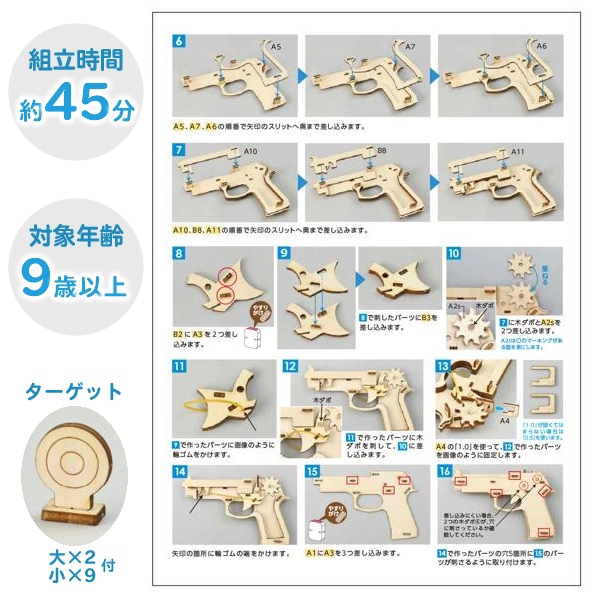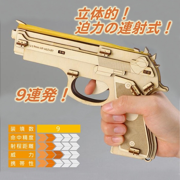 工具不要で連射式輪ゴム鉄砲がつくれる!木製連射式輪ゴム鉄砲組立キットです。