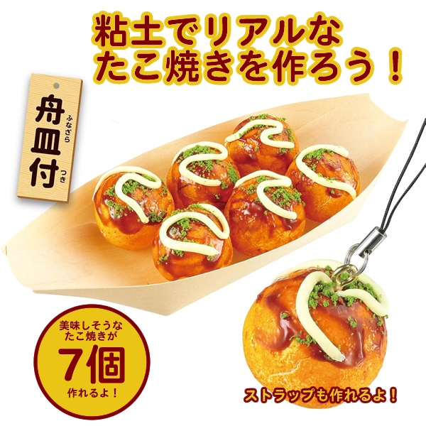 つぶつぶねんど(100g)×1、絵の具(黄・オレンジ)×各1、たこやきソース用液×2、紙ねんど×1、紅ショウガ用チップ×1、青のり用スポンジ×1、舟皿×1、チャック付きポリ袋×1、ストラップ×1、ヒートン×1、接着剤×1、スポンジタンポ×1